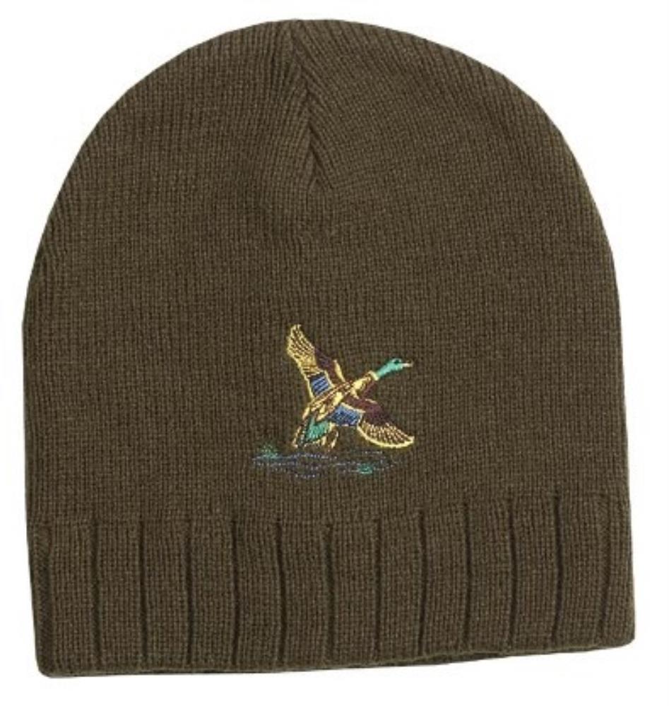 Le bonnet tricot de Merlet est orné d'une broderie de canard. Il est de couleur kaki et sera idéal par temps froid.