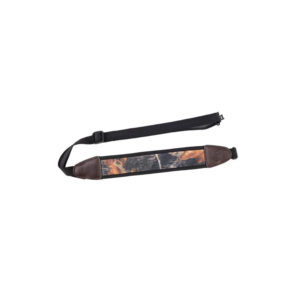 Composition : néoprène et polypropylène. Largeur : 6 cm. Fixation par anneaux de grenadière rapide à vis. Réglable en longueur. Coloris : noir et camouflage sous-bois.