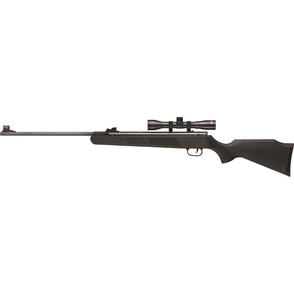 Calibre : 4,5 mm. Puissance : 19,9 Joules. Crosse synthétique. Guidon en fibre optique. Sécurité automatique. Vendue avec une lunette de visée et colliers : Grossissement : 4x. Diamètre d'objectif : 32 mm. Poids : 3,4 kg.
