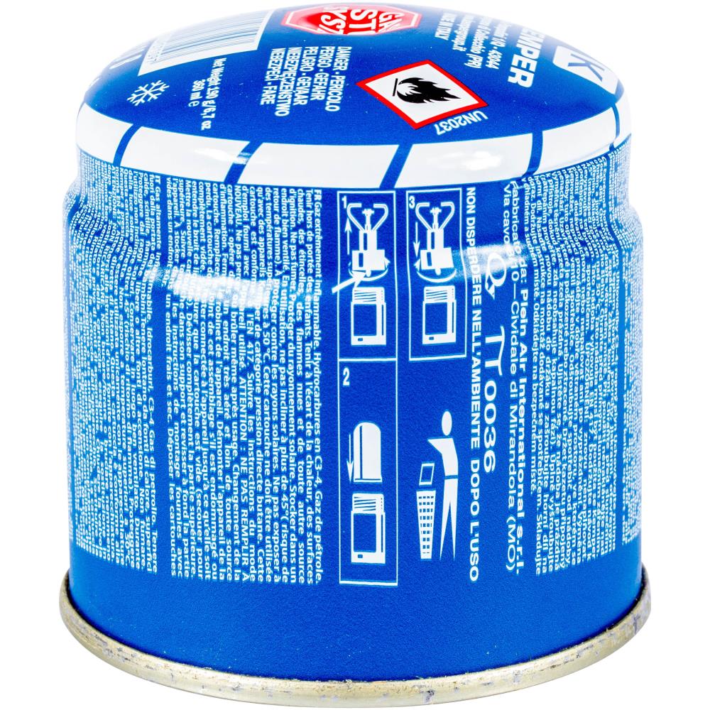 Type de gaz : butane. Dimensions : 9 x 9 cm. Conforme à la norme EN417/2011. Système : Stop Gaz System® qui bloque le passage du gaz en cas de dévissage. Poids : 190 grs.