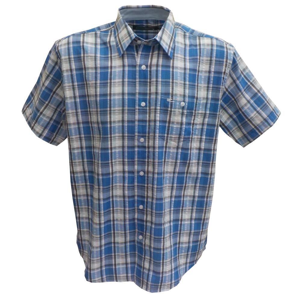 Composition : 60% coton, 40% polyester. Coloris : carreaux bleus, blancs et gris. Tailles : du S au 4XL. Tous types d'activités. Manches courtes. Poche poitrine. Fermeture par boutonnage.