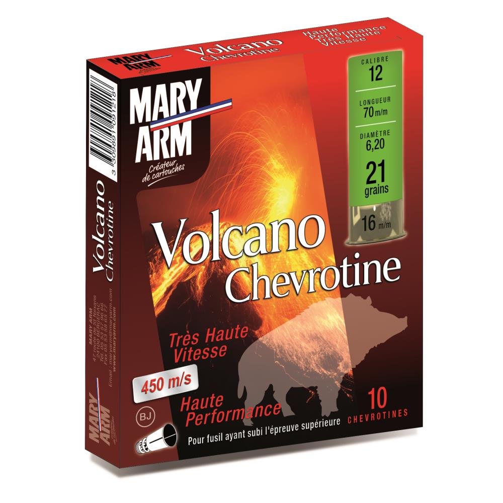 La cartouche Volcano chevrotine de Mary Arm est une cartouche chevrotine haute performance annoncée avec une vitesse de sortie à 450 m/s. Sa charge de 21 grains et sa bourre à jupe lui permettent d'être efficace sur le grand gibier.