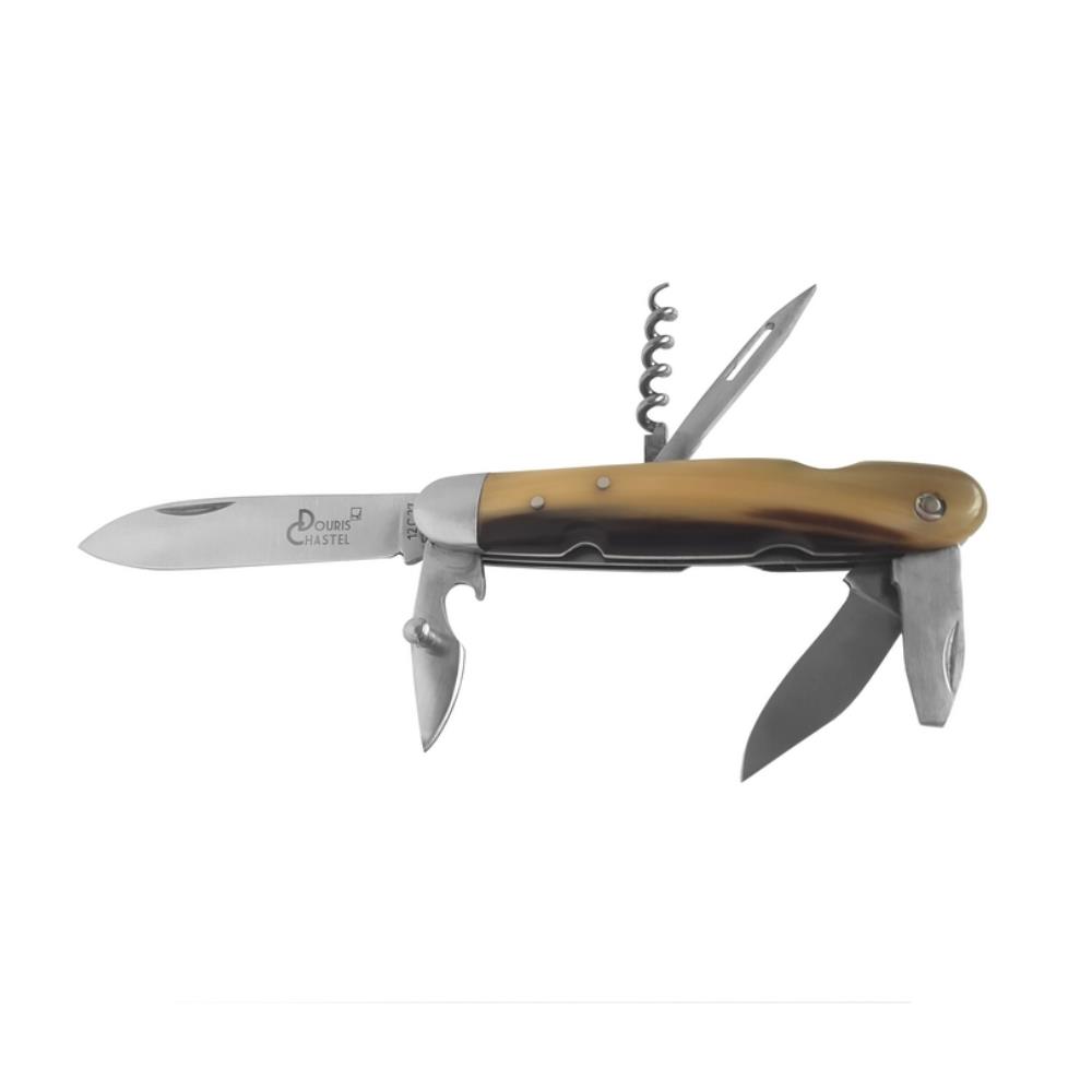 Le couteau navette 6 pièces de la marque Douris Chastel est un couteau multifonctions en point de corne. Le couteau dispose d'une lame principale, d'un tire-bouchons, d'un ouvre-boite décapsuleur, d'un poinçon, d'un tournevis plat, d'une petite lame canif. Le couteau est vendu dans un étui en cuir.