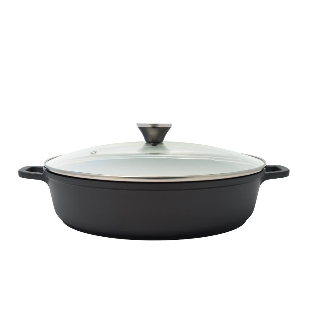 Cette cocotte basse d'une capacité de 6,5 litres est parfaite pour préparer des plats mijotés savoureux. Elle est équipée d'un couvercle en verre avec une ouverture pour laisser passer la vapeur, ainsi que d'un revêtement antiadhésif pour éviter que les aliments ne collent au fond. Cette cocotte est compatible avec tous les types de feux, y compris l'induction, ce qui en fait un ustensile polyvalent pour toutes les cuisines.