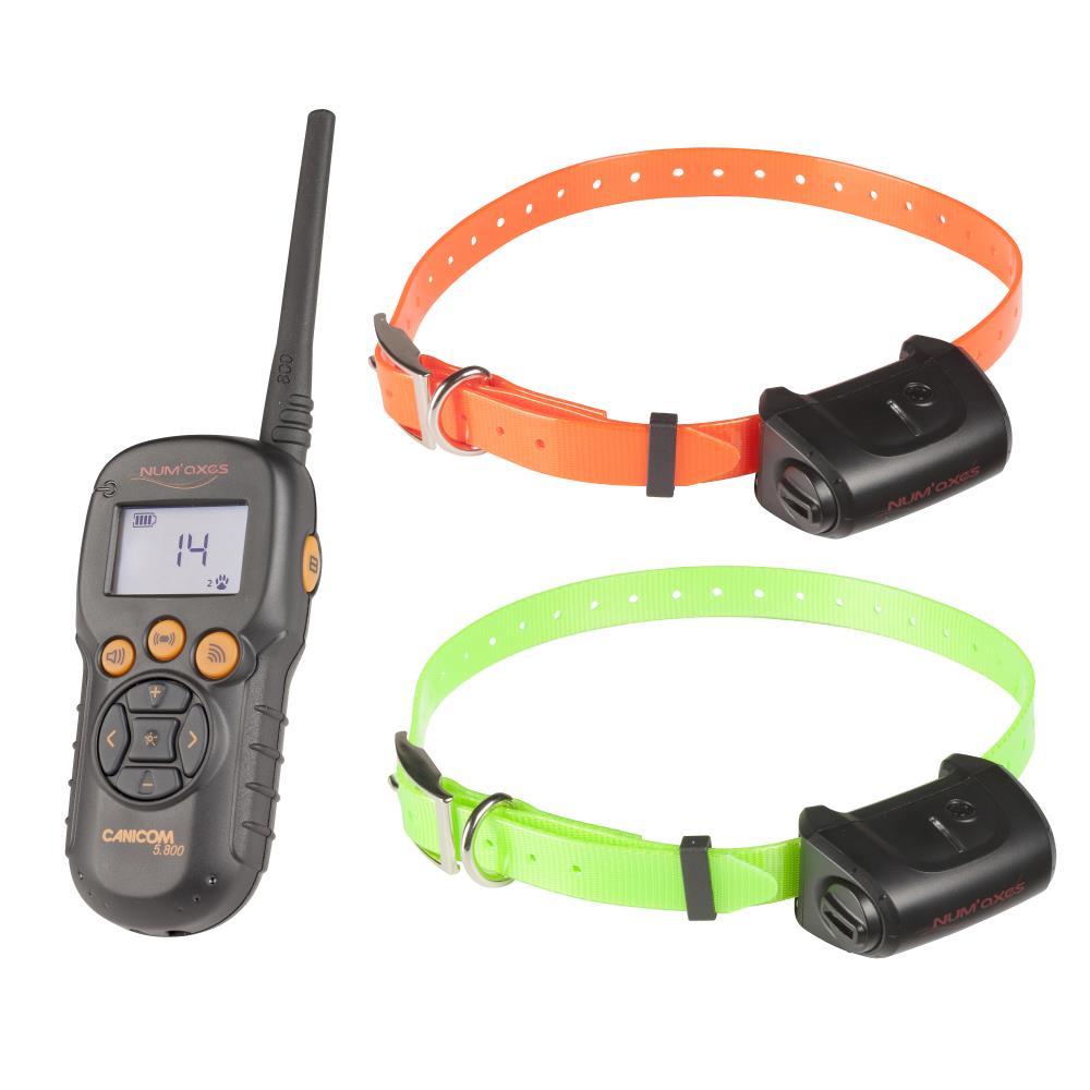 Bips sonores. Portée : jusqu'à 800 m. 20 niveaux de stimulation. Collier étanche à l'immersion. Jusqu'à 2 chiens. 2 colliers de dressage Canicom 5 équipé d'électrodes courtes, 1 sangle polyuréthane orange, 1 sangle polyuréthane vert fluo, 2 piles lithium 3 Volts CR2 pour les colliers, 1 télécommande Canicom 5.800 équipée d'une pile lithium 3 Volts CR2, 1 accessoire multifonctions (outil pour dévisser le bouchon de pile du collier + clé magnétique + testeur), 2 jeux de 2 électrodes longues, 1 dragonne, 1 guide d'utilisation, 1 mallette rigide de transport. Tous les colliers de dressage Canicom 5 fonctionnent avec toutes les télécommandes de la gamme Canicom 5.