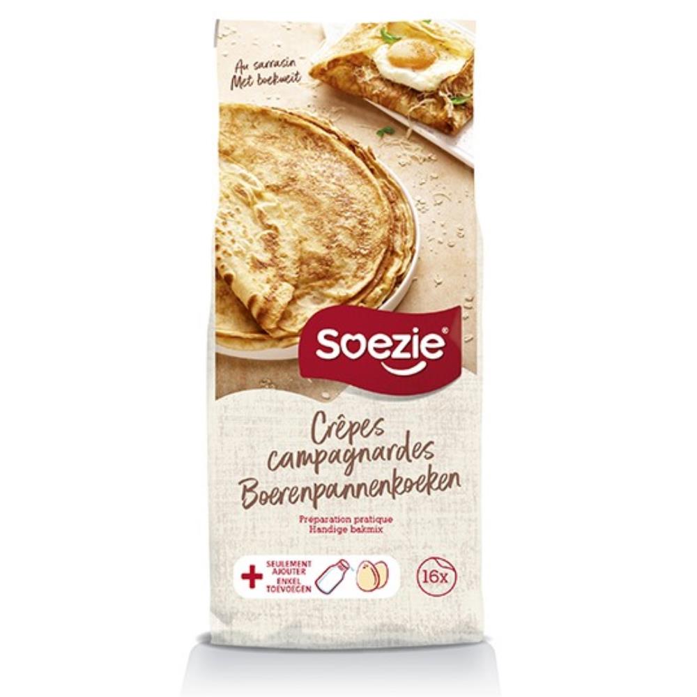 La préparation pour crêpes campagnardes de Soezie est conçue à base de farine de blé et de sarrasin, pour réaliser des crêpes consistantes et nourrissantes.