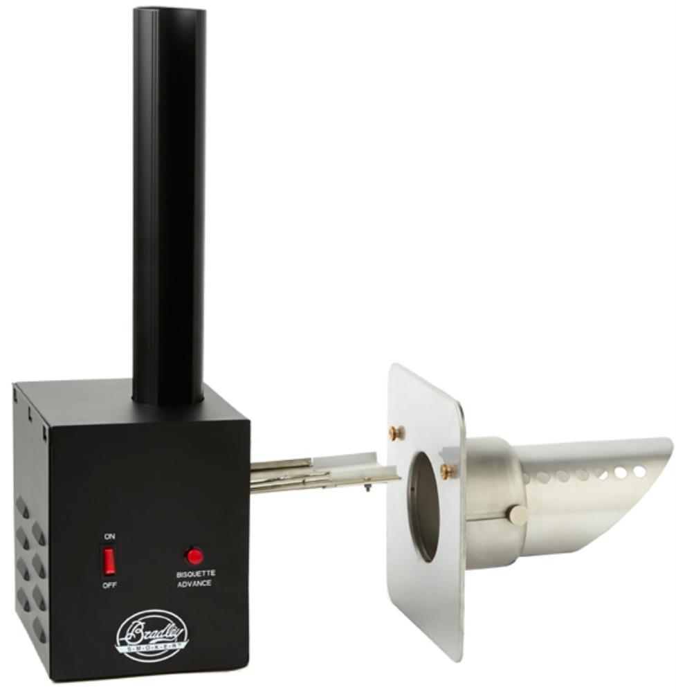 d’acier inoxydable et rempli le même but que le générateur de fumée qui équipe les fumoirs originaux de chez Bradley®, avançant les «bisquettes » sur la plaque chauffante. Ce qui simplifie au maximum sont utilisation étant donné que les paramètres de contrôles sont limités par un bouton poussoir on/off et le bouton d’avancement de la «bisquette » utilisé afin de la positionner sur la plaque chauffante. Pour le reste, l’alimentation des bisquettes se fait automatiquement. La deuxième partie de l’appareil est constitué d’une plaque inoxydable, équipé d’un col ajustable sur lequel le générateur de fumée rentre par le biais de 2 cosses. Cela permet au générateur de fumée d’être facilement retirée de la plaquette de fixation afin d’en faciliter le nettoyage et l’entreposage. L’idée est de maintenir en permanence la plaquette à la structure utilisé pour le fumage.Lire la suite