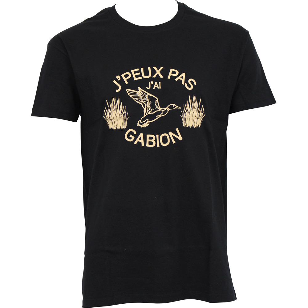 Le T-shirt "J'peux pas j'ai gabion" de Bartavel est un tee shirt noir en coton parfait pour les chasseurs de gibier d'eau. Sur le devant, la phrase "J'peux pas j'ai gabion" est imprimée en beige.