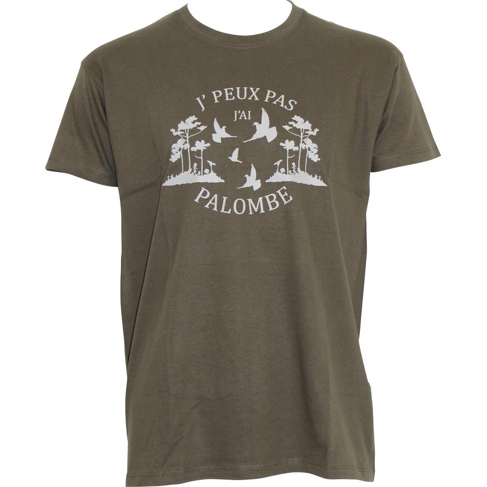 Le T-shirt "J'peux pas j'ai palombe" de Bartavel est un tee shirt kaki en coton parfait pour les chasseurs de pigeons et de palombe. Sur le devant, la phrase "J'peux pas j'ai palombe" est imprimée en beige.
